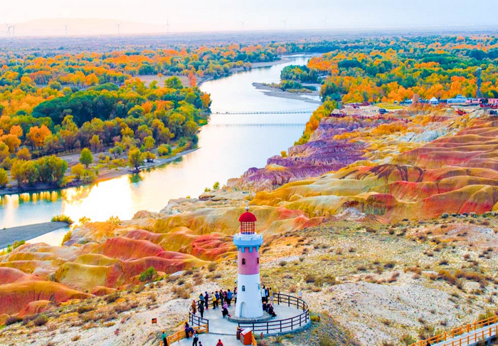 Bãi Ngũ Sắc – là một trong những thắng cảnh thiên nhiên độc đáo bậc nhất Tân Cương, nổi tiếng với những dải địa hình nhiều màu sắc trải dài giữa vùng sa mạc rộng lớn. Các lớp đất đá đỏ, vàng, cam, nâu, xám được hình thành qua hàng triệu năm kiến tạo địa chất, tạo nên khung cảnh rực rỡ như một bức tranh thiên nhiên khổng lồ. Khi ánh nắng chiếu xuống, đặc biệt vào sáng sớm hoặc chiều muộn, màu sắc nơi đây càng trở nên sống động và huyền ảo. Không gian hoang sơ, tĩnh lặng mang đến cảm giác choáng ngợp trước vẻ đẹp hùng vĩ của thiên nhiên Tây Bắc Trung Quốc