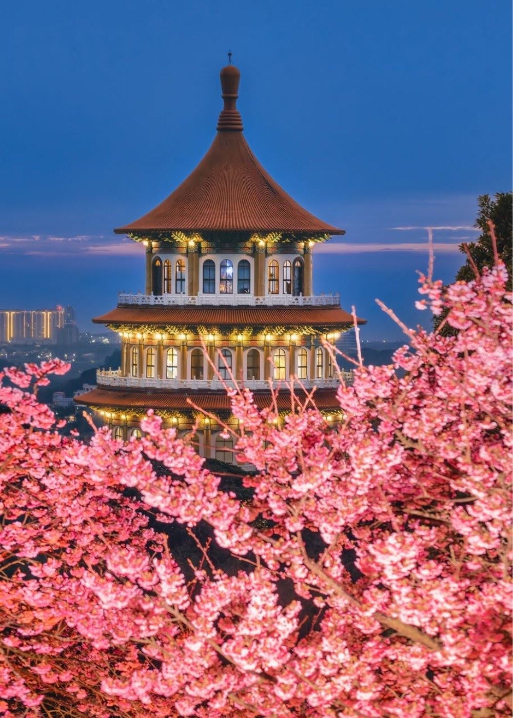 Đền Thiên Nguyên Vô Cực – một trong những điểm ngắm hoa đào ấn tượng nhất Đài Loan mỗi độ xuân về. Quý khách sẽ chinh phục con đường bậc thang đỏ rực uốn lượn giữa đồi hoa, nơi được ví như “chốn bồng lai giữa nhân gian” khi hoa đào nở rộ (dự kiến từ giữa tháng 2 – giữa tháng 3 tùy thời tiết). Đây cũng là thời điểm lý tưởng để du khách chụp hình lưu niệm với khung cảnh mùa xuân rực rỡ khó quên.
