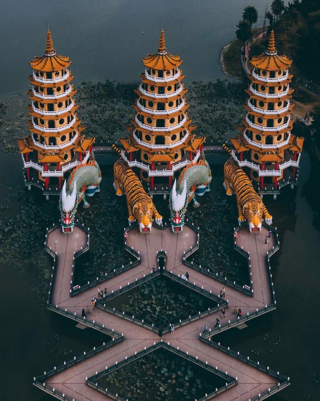 · Tại đây có Tháp Long Hổ: là một trong những ngôi chùa có kiến trúc đẹp nhất ở Đài Loan. Ngôi chùa có hai tòa tháp chính là tháp Long và tháp Hổ, mỗi tháp cao 7 tầng, cửa ra vào được thiết kế độc đáo với một bên là Rồng, một bên là Hổ với ngụ ý vào Rồng ra Hổ tượng trưng cho cát tường, thịnh vượng và may mắn.
