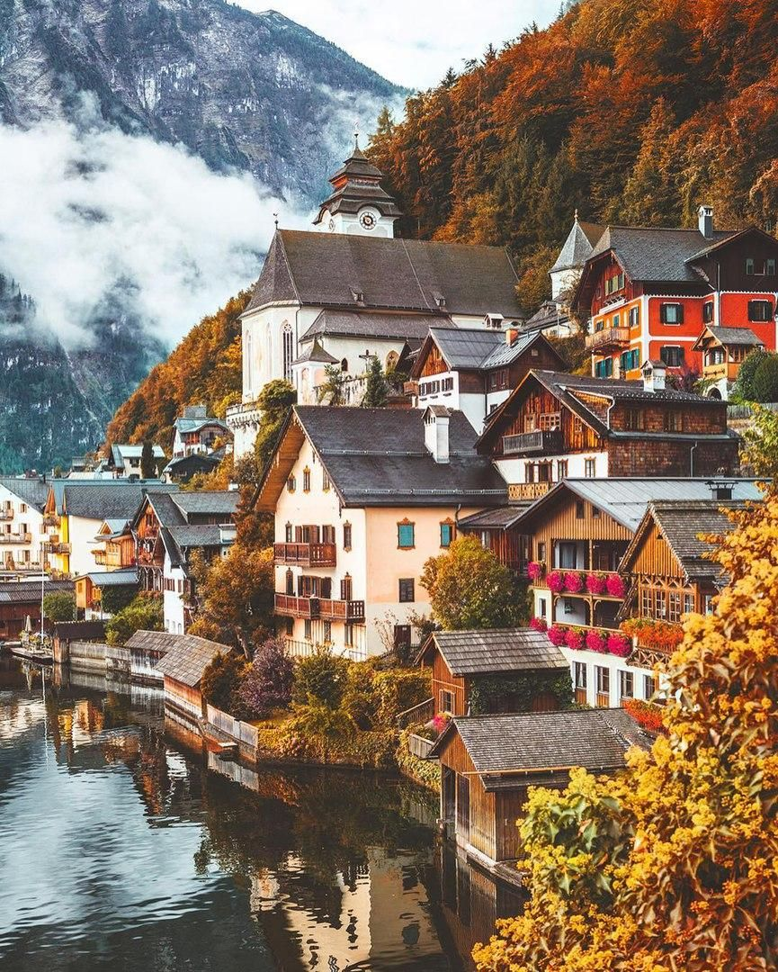 Hallstatt, ngôi làng ven hồ đẹp như tranh vẽ, trở nên quyến rũ hơn bao giờ hết khi mùa thu đến. Những ngôi nhà gỗ cổ kính được bao phủ bởi lá vàng, phản chiếu trên mặt hồ yên ả tạo nên khung cảnh nên thơ.