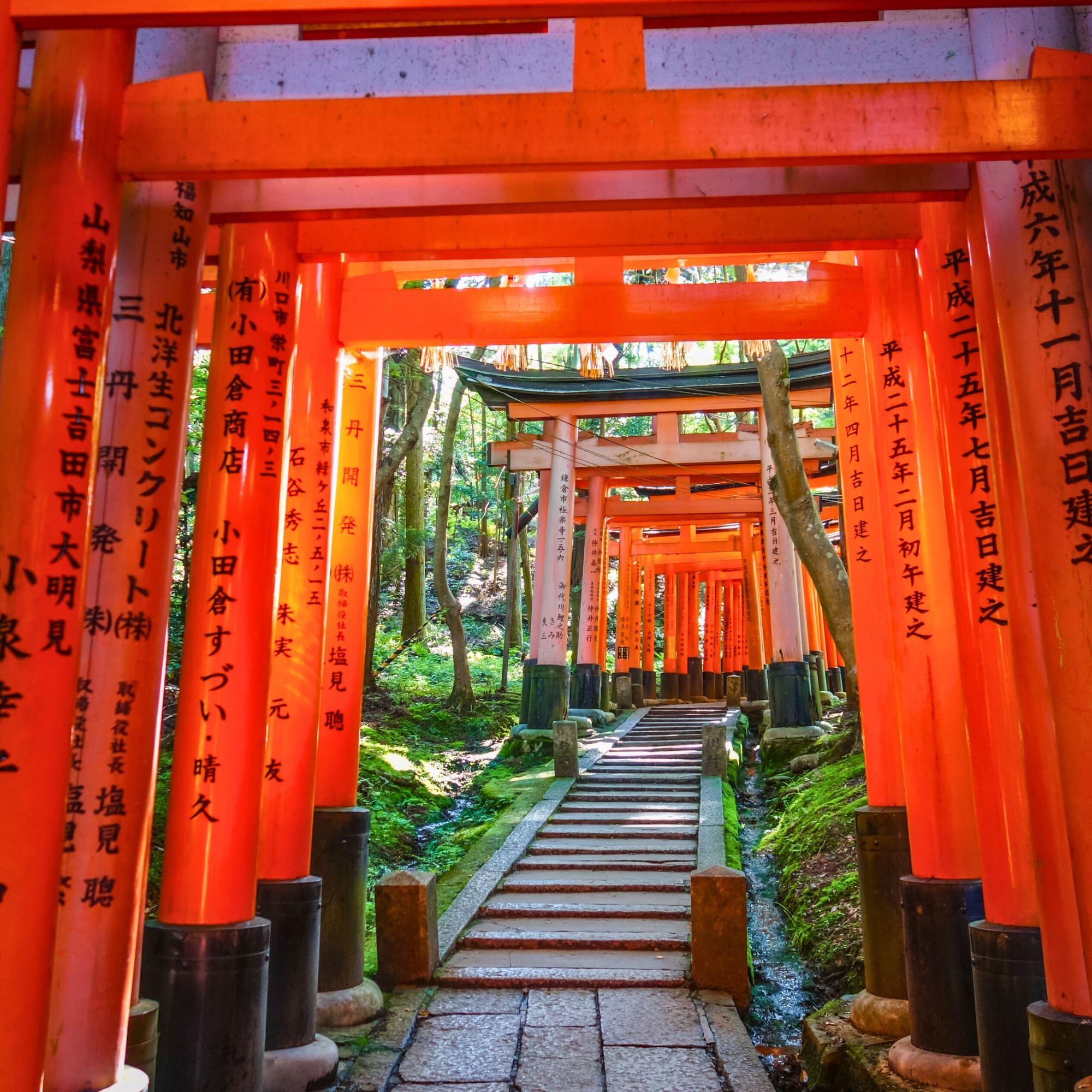 · Đền Fushimi Inari (đền 1000 cột) thờ phụng Inari – vị thần phù hộ cho mùa màng bội thu và kinh doanh phát đạt. Con đường với những cánh cổng Torii màu cam rực rỡ dường như vô tận chạy dọc lên núi Inari tạo nên một khung cảnh ấn tượng và là một trong những hình ảnh nổi tiếng nhật Nhật Bản.